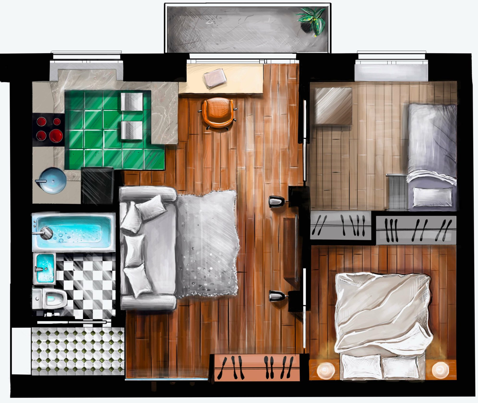 2D скетч— это скетч планировки с расстановкой мебели вид сверху, которые выглядит объемно и стоимость такой работы составляет 3 тыс. руб. за квартиру до 50 кв. м далее цена по договоренности (в зависимости от количества мебели и реалистичности)